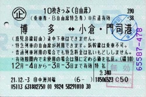博多から小倉・門司港の間に設定されていた、10枚綴りの特急回数券10枚きっぷです。 これは金券ショップでバラ売りしていたのを買って使ったものです。 10枚きっぷの1枚あたりの値段は、4枚きっぷの1枚あたりと同じになっていました。 但し、有効期間は購入…