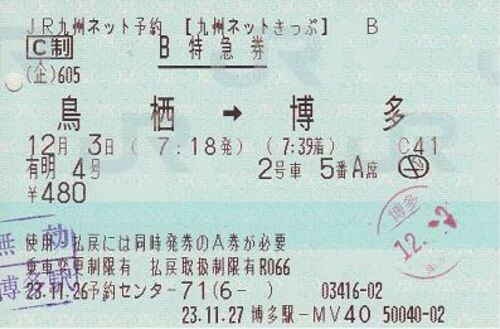 鳥栖から博多までの、特急有明4号の指定席用の九州ネットきっぷです。 有明4号は長洲始発博多行きの特急列車ですが、平日は普通車全車自由席で運転されます。 そのため、有明4号の普通車指定席の設定があるのは土日祝日のみとなっています。 私が乗った時は…