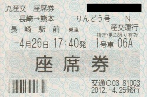 長崎と熊本を結ぶ高速バス・りんどう号の座席券です。降車時に回収されています。 これも発券時に座席を変更して貰っています。 九州産交のりんどう号 りんどう号は長崎と熊本を乗り換えなしで結ぶ唯一の交通機関です。所要時間はだいたい3時間ぐらいです。 …