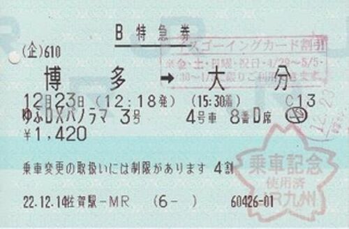 博多から大分までの特急ゆふDX3号のパノラマシートの特急券です。 ナイスゴーイングカードによって4割引の値段となっています。 特急ゆふDXは、2011年1月まで運転されていた久大本線の特急列車で、1日に1.5往復の運用に就いていた関係で偶数日と奇数日で特急…