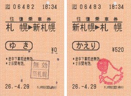 札幌駅の券売機で購入した、札幌〜新札幌間の往復乗車券です。 何の変哲もない只の往復乗車券ですが、私はてっきりMVではない券売機だからエドモンソン券(A型券)の二枚綴りで発券されるとばかり思っていたので、85mm券が出てきた時は驚きました。 これはJR…