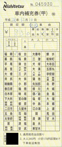 荒木から博多までの、車内補充券の乗車券です。 車掌の持っている端末から発券されたもので、レシートタイプのものになっています。レシートタイプの切符なので、自動改札には通せない事が記載されています。 荒木から210円区間の乗車券を、4126M列車(鹿児…