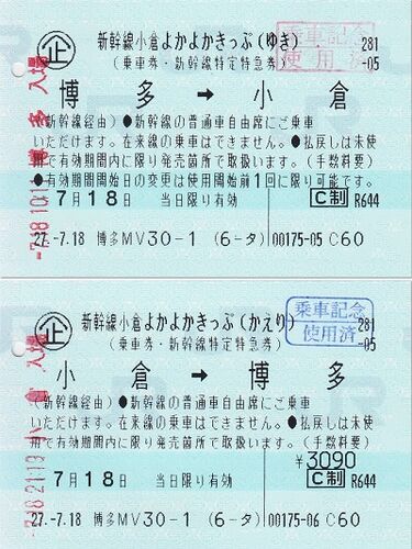 博多発の新幹線よかよかきっぷです。 増税前は販売額3,000円とキリのいい価格でしたが、増税後は3,090円になっています。 以前も同じものを紹介していますが、今回はJR九州の指定席券売機で購入したものです。 券面の下部に印字された「博多MV30-1 (6-タ)…