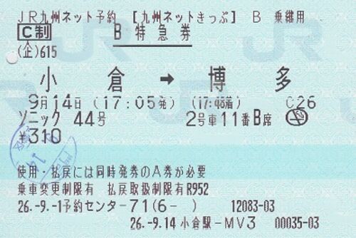 小倉から博多までの、特急ソニック44号と、 博多から佐賀までの、特急かもめ39号の特急券です。 小倉〜佐賀間の九州ネットきっぷとして購入したもので、どちらの券面の右上に「乗継用」と印字されています。 これに乗車券部分のA券を加えた3枚を利用しますが…