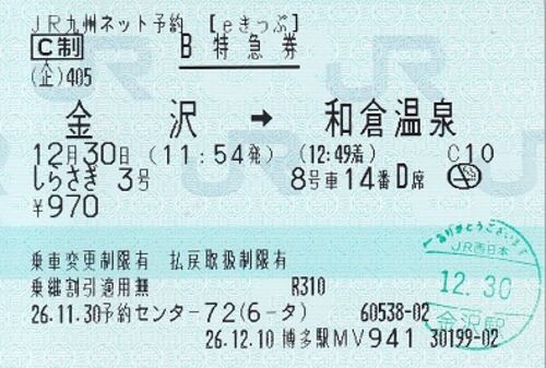 金沢から和倉温泉までの、特急しらさぎ3号の特急券です。 eきっぷを適用させています。 現在の特急しらさぎ号は全て金沢止まりとなっていますが、北陸新幹線金沢開業以前は七尾線の和倉温泉駅まで特急しらさぎ号が1往復だけ乗り入れていました。 七尾線直通…