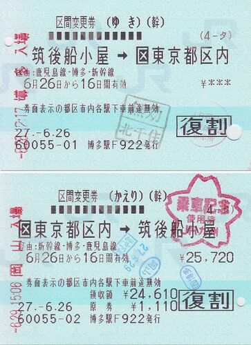 筑後船小屋から東京都区内までの、往復割引適用の区間変更券です。 筑後船小屋駅から1,110円区間までの片道乗車券を在来線駅舎側の券売機で購入し、それを博多駅の新幹線乗換改札の窓口で東京都区内までの往復に変更したものです。 himatsubushi2.hatenablog…