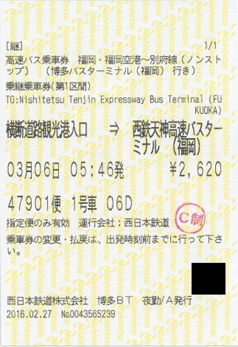 横断道路観光港入口から西鉄天神高速バスターミナルまでの、高速バス・とよのくに号のノンストップ便の乗車券です。 とよのくに号の別府発着のノンストップ便に関しては以前は便指定制で座席は自由席だったと記憶していますが、いつの間にか座席指定制に変更…
