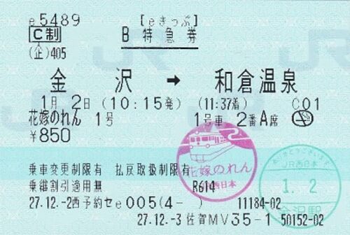 金沢から和倉温泉までの、特急花嫁のれん1号の特急券です。 e5489からeきっぷで購入したものです。なお、花嫁のれんをe5489で予約・購入する場合、座席指定はできません。 車内の改札では、花嫁のれん専用の検札印を押されました。 花嫁のれんの乗車日の4日…