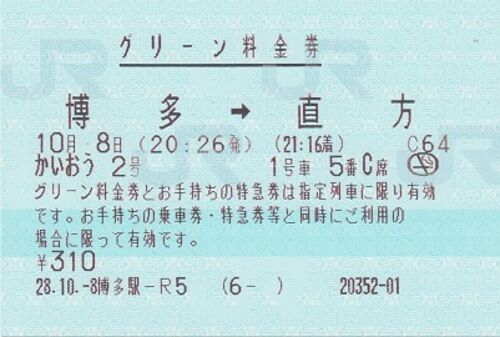 博多から直方までの、特急かいおう2号のグリーン料金券です。 博多~直方間の2枚特急券と併用したものです。 himatsubushi2.hatenablog.com グリーン料金券は主に企画乗車券等を利用する際、グリーン車へアップグレードするために発券されます。 特急のグリ…