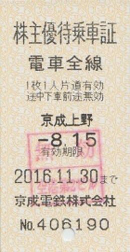 京成電鉄の株主優待乗車証です。 株主優待乗車証は、株主名簿に記載されている株主に対して発行される優待券となっています。 京成電鉄の路線であれば、全線で1枚1人片道で距離に関係なく無料で利用することができるものとなっています。 縦に印字されたエド…