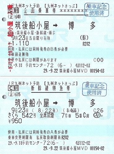 筑後船小屋から博多までの、新幹線さくら542号の九州ネットきっぷです。 筑後船小屋〜博多間の九州ネットきっぷの販売額は、同区間の九州新幹線2枚きっぷの1枚あたりと同額に設定されています。2枚きっぷのほうは自由席利用で指定席利用には追加料金がかかり…