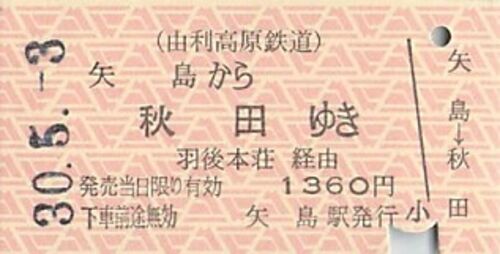 矢島から羽後本荘経由で秋田までの連絡乗車券です。 矢島駅からJRへの連絡運輸があり、連絡乗車券を購入することができます。秋田駅までのものに関しては硬券がありました。日付は入場券が西暦だったのに対し、こちらは和暦の"30.5.-3"となっていました。 ど…