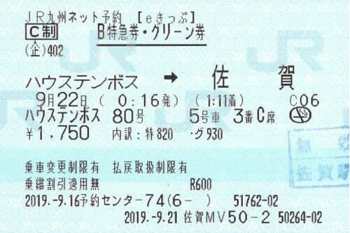 ハウステンボスから佐賀までの、特急ハウステンボス80号の特急券・グリーン券です。 特急ハウステンボス号は博多~ハウステンボス間を運転している列車ですが、ハウステンボスで何かイベントが行われる際は臨時列車を増発することがあります。 時刻に注目 こ…