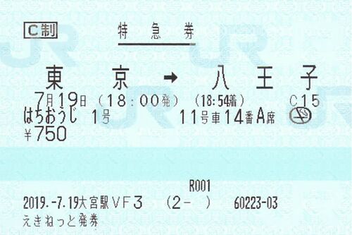 東京から八王子までの、特急はちおうじ1号の特急券です。 特急はちおうじ号は、東京・新宿~八王子間で運転されている中央東線の特急列車です。 2019年3月まで運転されていた「中央ライナー」を特急格上げしたもので、平日だけに運転されています。 himatsub…