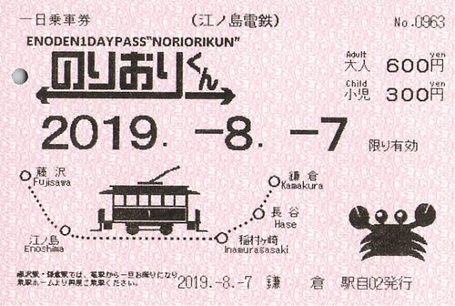 江ノ島電鉄の一日乗車券「のりおりくん」です。 江ノ島電鉄線の全線が1日乗り放題となる乗車券です。これは鎌倉駅の江ノ電の券売機で購入したもので、簡単な路線図が描かれています。 券面右下にはカニの絵が描かれていますが、これは購入した季節によって絵…