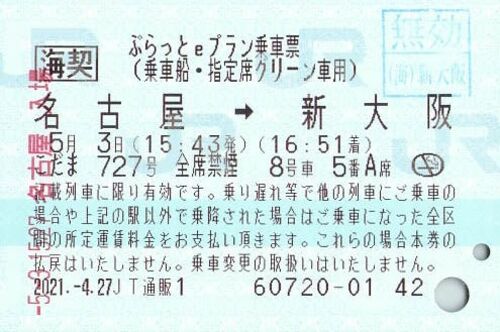 名古屋から新大阪までの、新幹線こだま727号のぷらっとeプラン乗車票です。グリーン車用を利用しています。 JR東海ツアーズが発売している、ぷらっとこだまの商品をネットで購入し、駅の指定席券売機で受け取ったものです。 地紋はJR東海のものになり、券面…