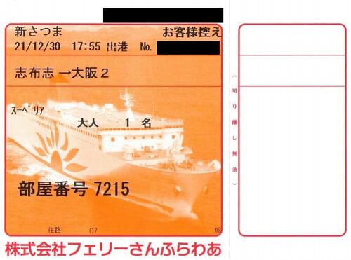 志布志発大阪行きのフェリーさんふらわあ「さんふらわあ さつま」の乗船券です。 発券時にはお客様控えの左側に細長い券が付いていますが、乗船時の改札で切り離されます。 フェリーさんふらわあは、大阪南港*1と別府観光港・志布志港、神戸六甲アイランド港…