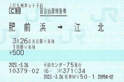 肥前浜から博多までの、特急鹿島酒蔵ツーリズム2号の特急券です。 eきっぷを適用しています。 特急鹿島酒蔵ツーリズム号は2023年3月25日と26日に佐賀県鹿島市で行われていた「鹿島酒蔵ツーリズム2023」のアクセスとして、博多~肥前浜間で運転された臨時列車…