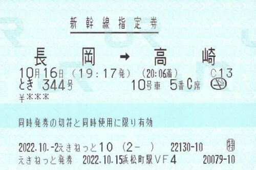 長岡から高崎までの、新幹線とき344号の指定券です。 himatsubushi2.hatenablog.com 鉄道開業150周年記念 JR東日本パスの指定として取ったものです。 長岡から高崎まで所要時間は1時間も満たないのですが、指定枠が余りそうだったので指定席を取りました。 …