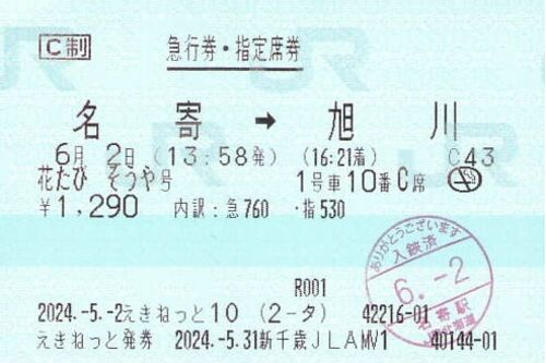 名寄から旭川までの、急行花たびそうや号の急行券・指定席券です。 急行花たびそうや号は、5月から6月初旬にかけて宗谷本線で運転されている臨時列車です。 旭川~稚内間を土日の2日かけて1往復するダイヤとなっていて、 土曜日が旭川発稚内行き、日曜日が稚…