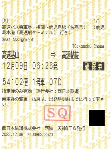 高速基山から高速帖佐までの、高速バス「桜島号」の確保券です。 九州島内の殆どのバス路線が有効期間内に乗り放題になる、SUNQパス全九州版と併用したものです。 窓口で座席指定を行うと、レシート状の確保券が渡されます。 SUNQパスで指定を取ると、券面に…