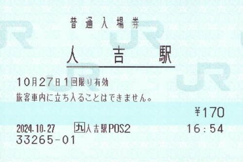 人吉駅の入場券です。 窓口で購入したもので、POSで発券されています。 肥薩線の八代~吉松間は、令和2年7月豪雨の影響で2025年2月現在も不通となっていて列車が走っていませんが、 人吉駅は窓口だけは営業をやっている状態でした。 恐らくはB&Sみやざきネッ…