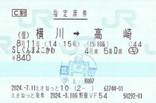 横川から高崎までの、SLぐんまよこかわの指定席券です。 SLぐんまよこかわは、横川から高崎まで蒸気機関車牽引の客車列車で運転していた列車です。 全車指定席となっていました。 JR東日本の「のってたのしい列車」に含まれるため、指定料金は840円となって…