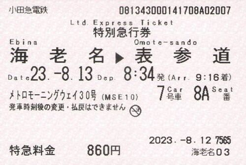 海老名から表参道までの、特急メトロモーニングウェイ30号の特急券です。 海老名駅は元々特急停車駅ではなかったのですが、 2016年以降は停車駅に追加されて、一部の特急が停車しています。 メトロモーニングウェイは、2018年3月から運行開始した小田急の特…