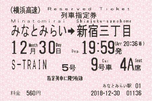 みなとみらいから新宿三丁目までの、S-TRAIN 5号の列車指定券です。 S-TRAINは西武・東京メトロ・東急・横浜高速鉄道が運行している座席指定制の有料列車です。 平日と土休日では運転区間が異なっていて、平日は所沢~豊洲間での運転、土休日は西武秩父・飯…