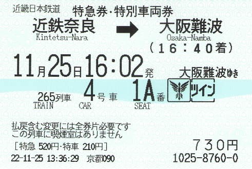 近鉄奈良から大阪難波までの、観光特急あをによし265列車の特急券・特別車両券です。